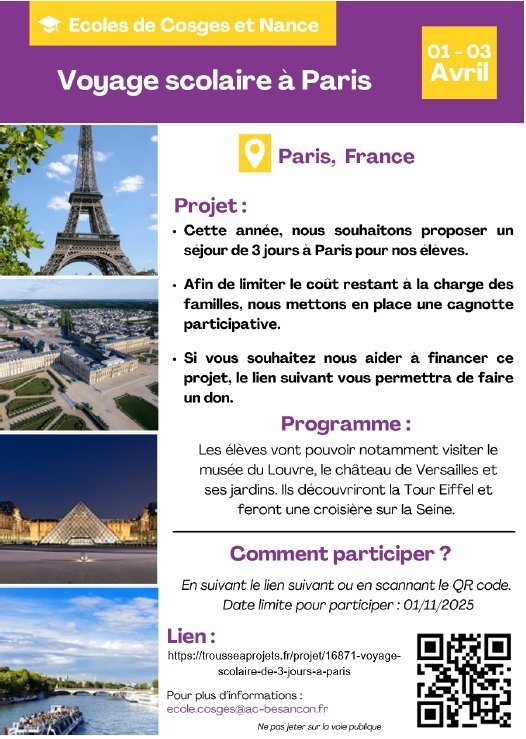 https://trousseaprojets.fr/projet/16871-voyage-scolaire-de-3-jours-a-paris ou en scannant de QR code. (date limite 01/11/2025)