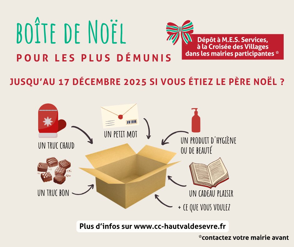 Le Centre Intercommunal d’Action Sociale (CIAS) du Haut Val de Sèvre renouvelle son engagement solidaire en coordonnant l’opération Boîtes de Noël. Jusqu’au 17 décembre 2025, participez à cet élan de générosité en confectionnant une boîte-cadeau destinée aux plus démunis.
