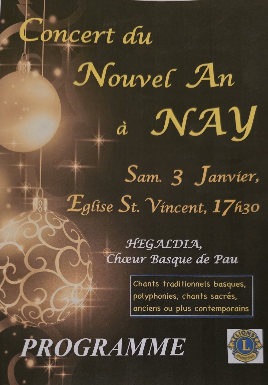 Les membres bénévoles du Lion's Club de Nay vous proposent de venir écouter le chœur d'hommes HEGALDIA le 3 janvier 2026 à 17h30.