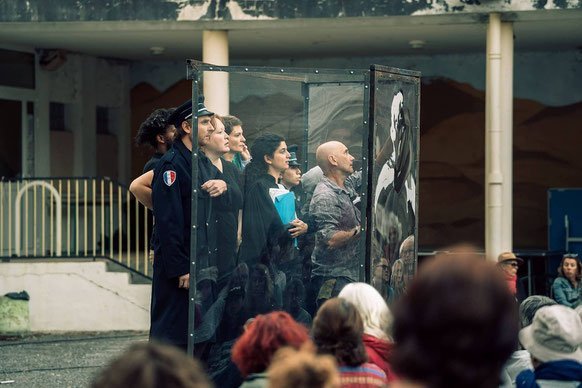 Dix comédiens, musiciens, plasticiens, danseurs incarnent tour à tour juges, prévenus, avocats, badauds ou policiers. Et dans le tumulte des vies qui pulsent et qui explosent, le public s’accroche à la voix de la narratrice déployant son carnet de bord, entre doutes et découvertes.
