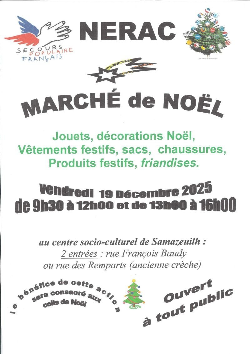 Le Secours Populaire organise un marché de Noël proposant divers articles : jouets, décorations de Noël, vêtements festifs, sacs, chaussures, produits festifs, friandises...