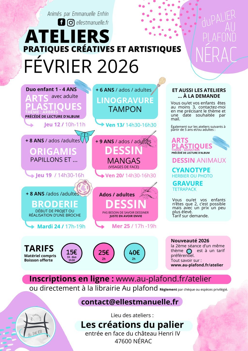 Emmanuelle Enfrin de l'atelier EllestManuelle propose divers ateliers créatifs durant tout le mois de février : arts plastiques, linogravure, origamis, dessins mangas, broderie, dessin.
