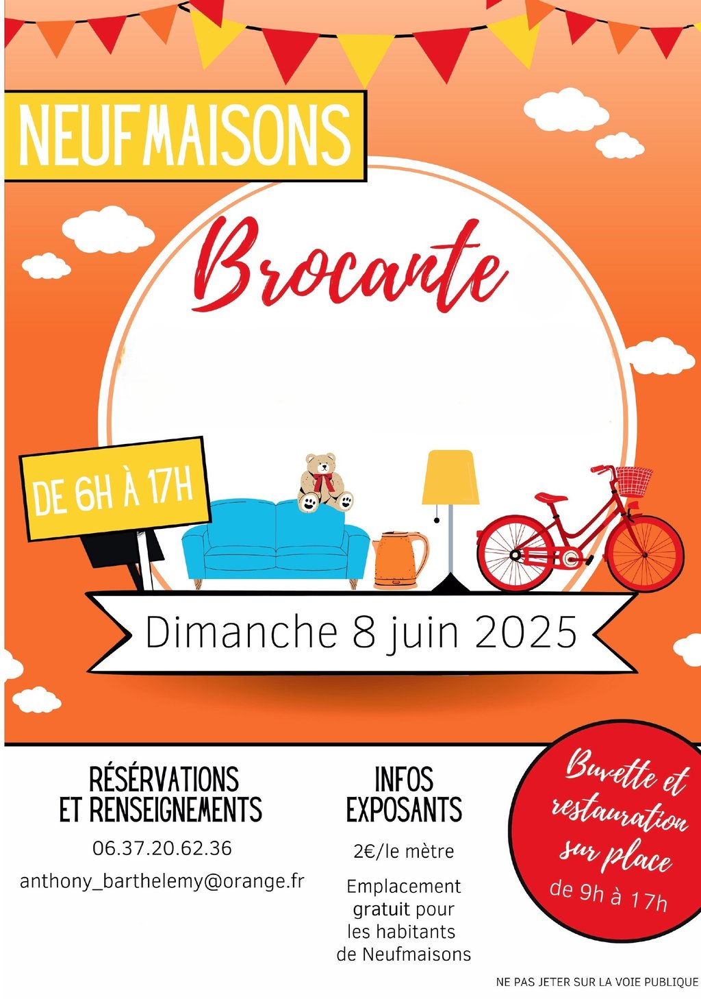 Brocante Dimanche 8 juin 2025 de 6h à 17h sur la place du village ainsi que dans la rue de Belgrade et rue du Moulin.