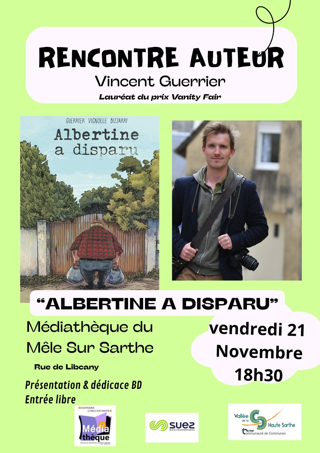 Rencontre avec l'auteur Vincent Guerrier lauréat du prix Vanity Fair pour la BD "Albertine a disparu" présention et dédicace le vendredi 21 novembre à 18h30 à la médiathèque du Mêle sur Sarthe rue de Libcany