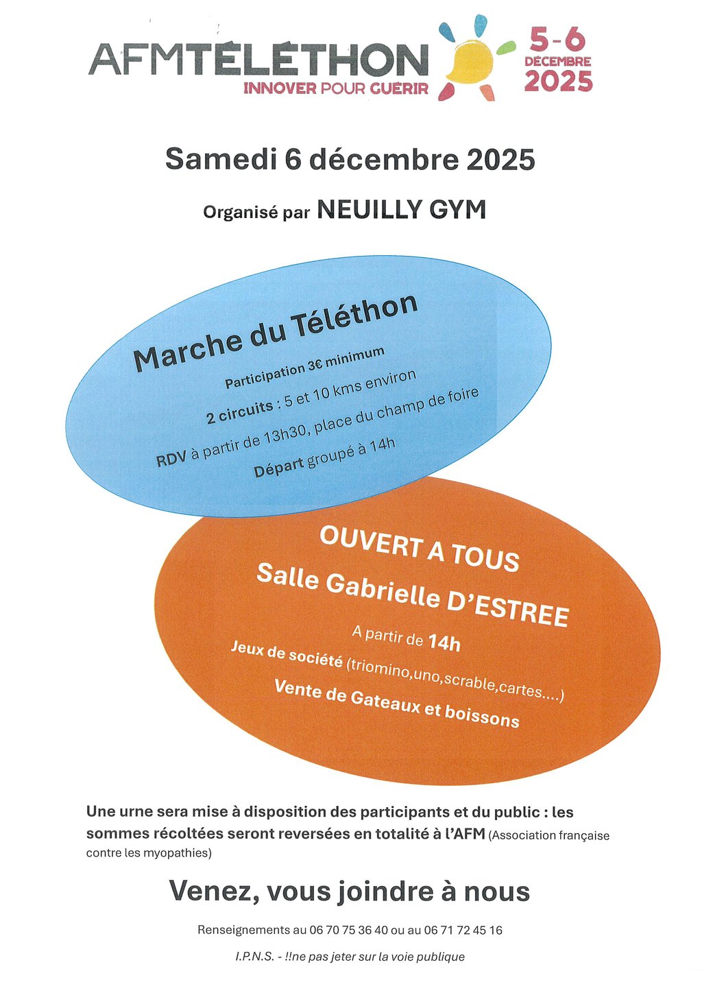Animations dans le cadre du Téléthon, organisé par Neuilly Gym : marche, jeux de société, vente de gâteaux et boissons