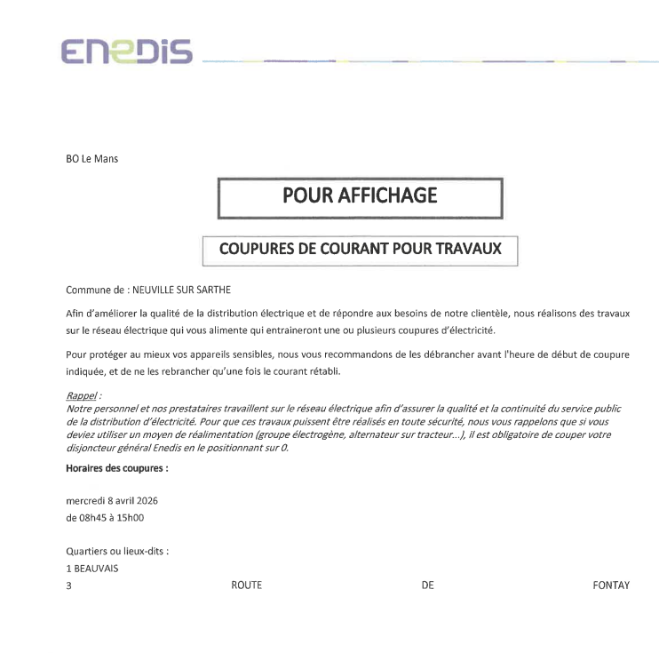 Coupure de courant mercredi 8 avril 2026 de 8h45 à 15h