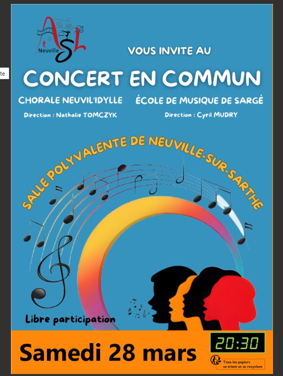 đ” les deux chorales Neuvil 'idylle de l'ASL Neuville et l'Ă©cole de Musique de SargĂ© donneront un concert en commun Ă la salle polyvalente de NEUVILLE SUR SARTHE - 26bis Grande Rue le LE SAMEDI 28 MARS 2026 Ă 20 h 30