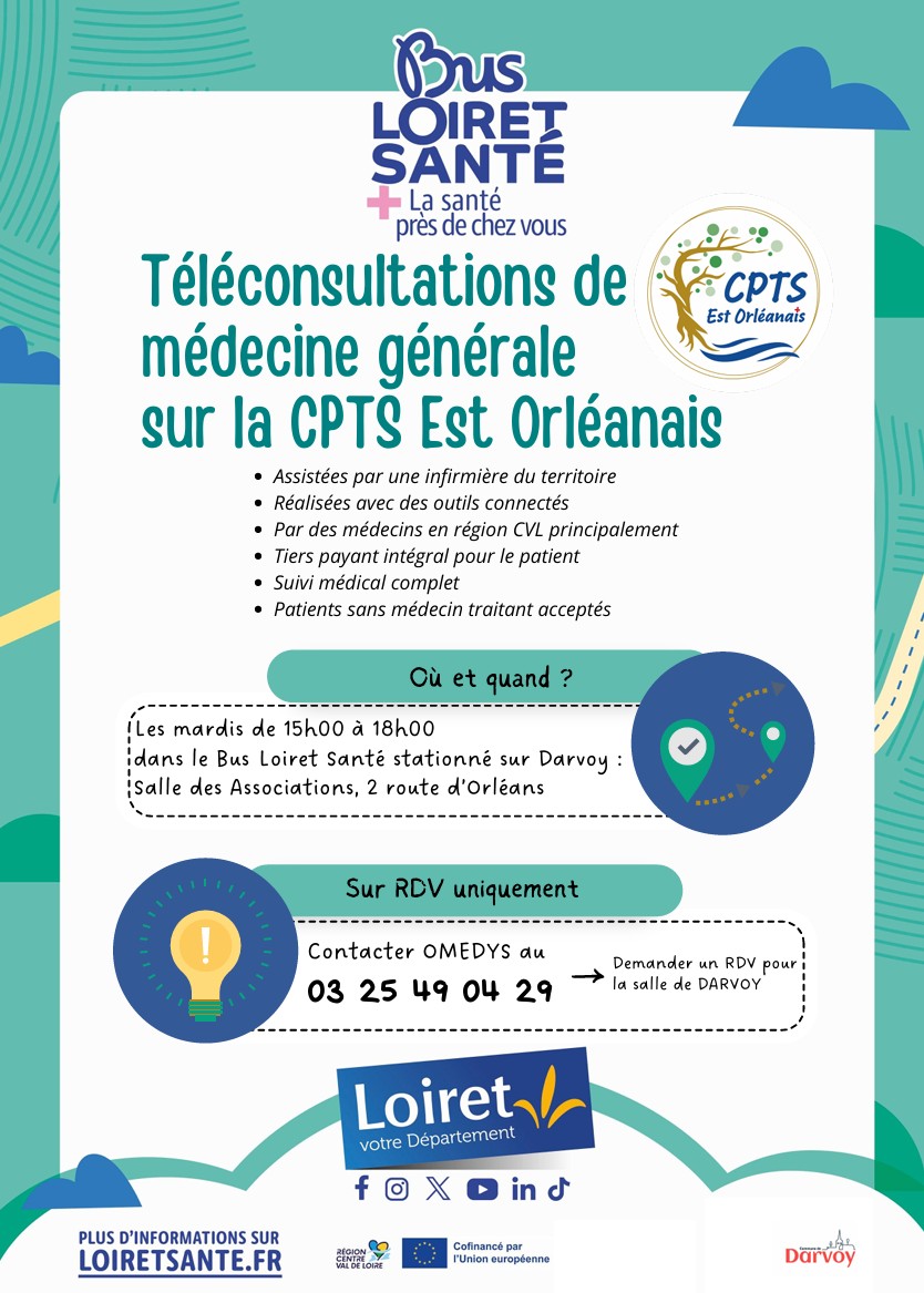 Les mardis de 15h00 à 18h00 dans le Bus Loiret Santé stationné sur Darvoy : Salle des Associations, 2 route d’Orléans