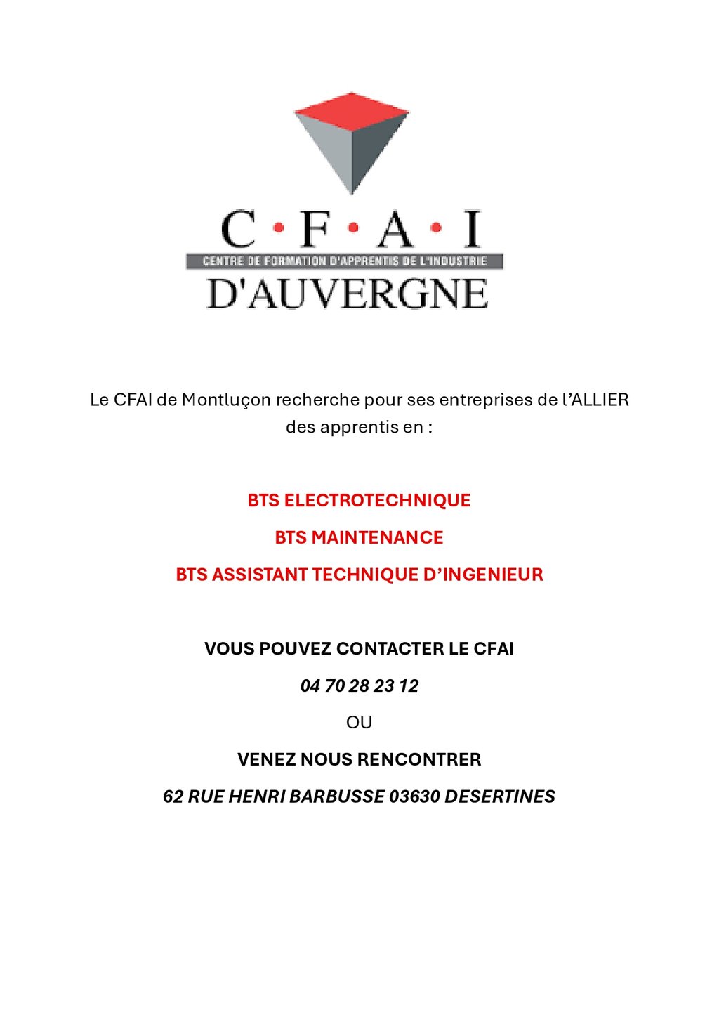 Le CFAI de Montluçon recherche des jeunes pour des BTS: