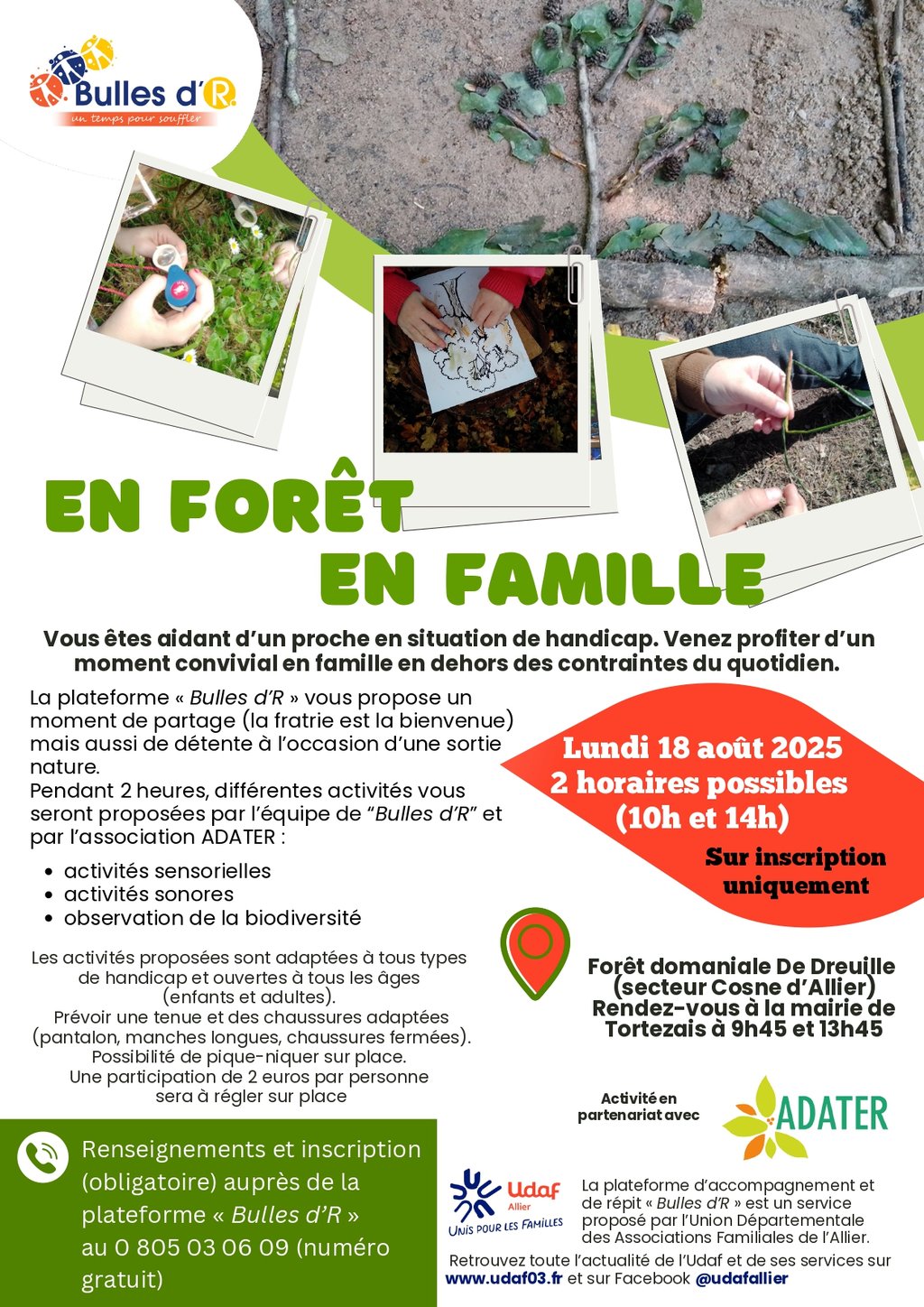 Inscription obligatoire auprès de la plateforme Bulles d’R au 0 805 03 06 09 (appel gratuit) ou par mail à : aidants03@udaf03.fr (attention nombre de places limité !)