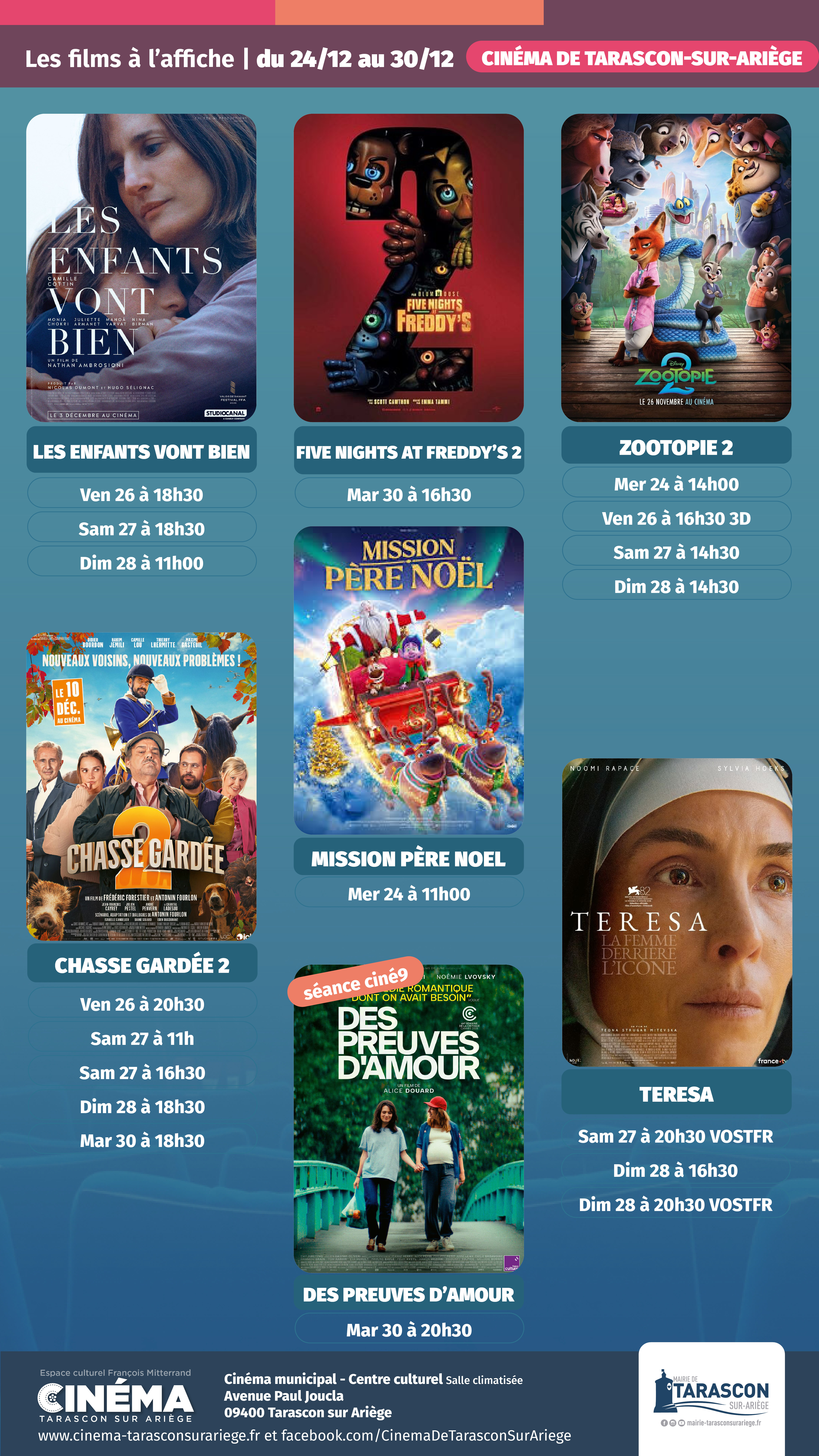 Programme à disposition dans le bâtiment ou sur le site de la mairie : https://cinema-tarasconsurariege.fr/