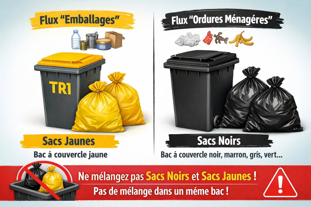 ❗ Ne mélangez jamais sacs noirs et sacs jaunes dans le même conteneur❗