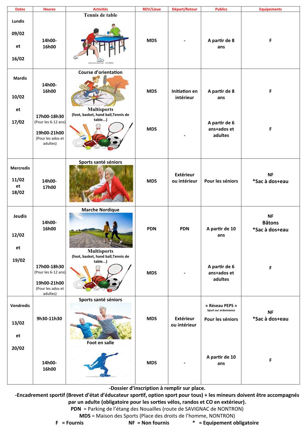 Sport pour Tous à Nontron : programme des vacances de février, proposé par le Service des Sports de la Ville de Nontron. Du lundi 09 février au vendredi 20 février.