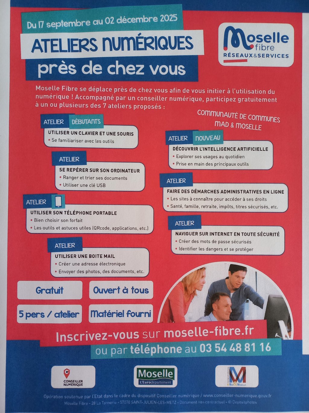 Inscrivez-vous dès maintenant aux ateliers numériques animés par des conseillers numériques Moselle Fibre : Utiliser un clavier et une souris, Utiliser une boite mail, Naviguer sur internet en toute sécurité, Utiliser son téléphone portable, Faire des démarches administratives en ligne, Se repérer sur son ordinateur, Découvrir l’intelligence artificielle. Différentes thématiques vous sont proposées.