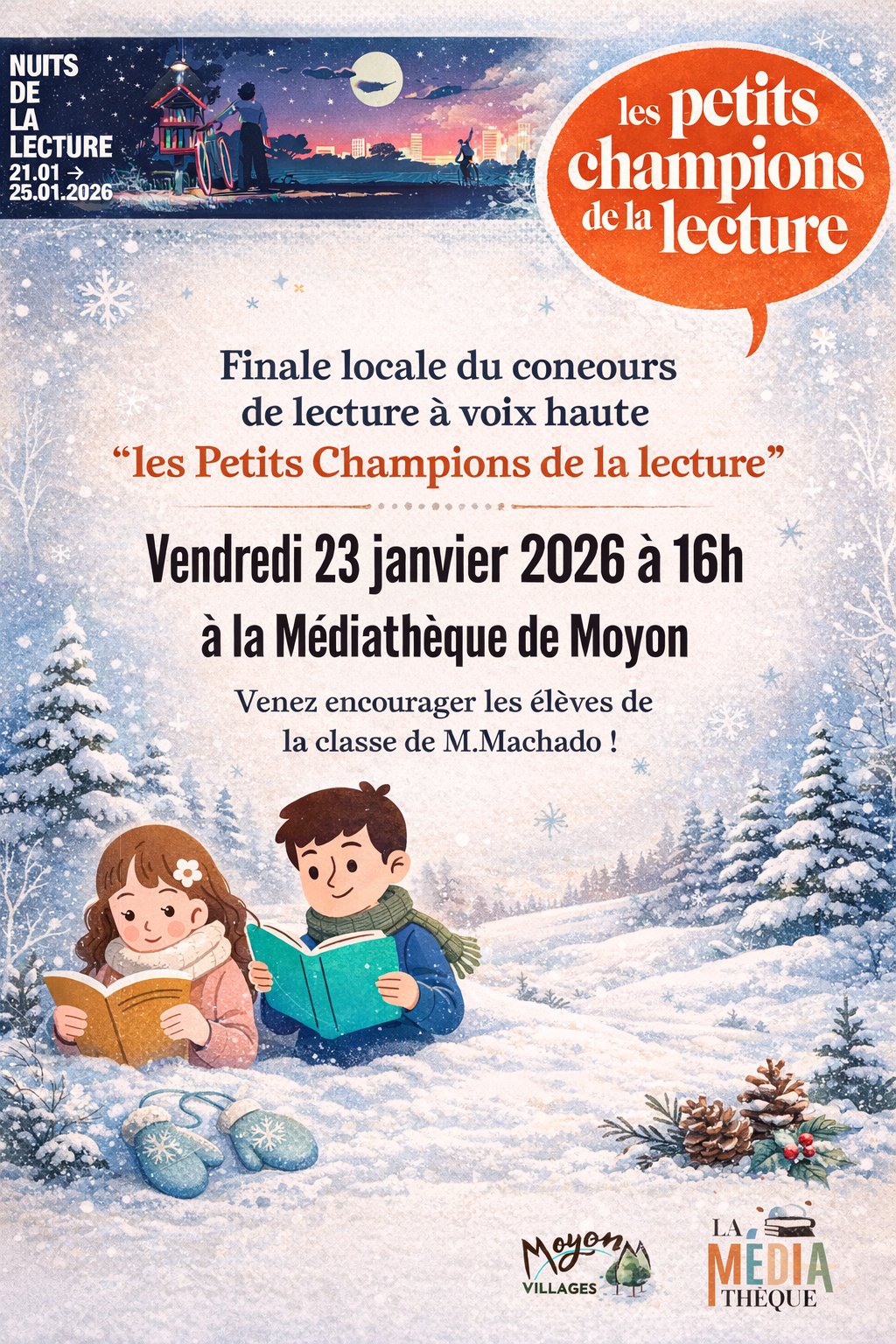 Venez encourager les élèves de CM1-CM2 de M.Machado qui participent au concours de lecture à voix haute "Les Petits champions de la lecture". Chacun lira un extrait de 3 minutes du livre de son choix et le jury désignera le qualifié pour l'étape supérieure.