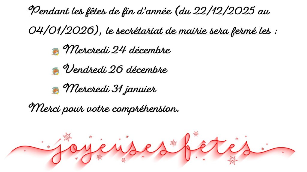 Pendant les fêtes de fin d’année (du 22/12/2025 au 04/01/2026), le secrétariat de mairie sera fermé les :