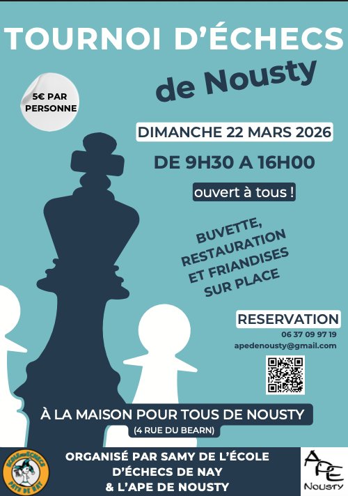 L'APE de Nousty, en collaboration avec Samy, organise, pour la troisième année consécutive, son désormais célèbre tournoi d'échecs.