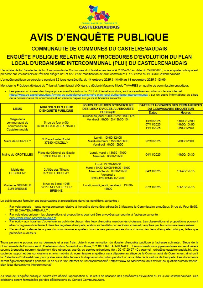 Les observations pourront être formulées par écrit sur le registre d’enquête, par voie postale 5 rue du Four Brûlé 37110 Château-Renault ou par courriel à l’adresse suivante : enquêteplui@cc-castelrenaudais.fr