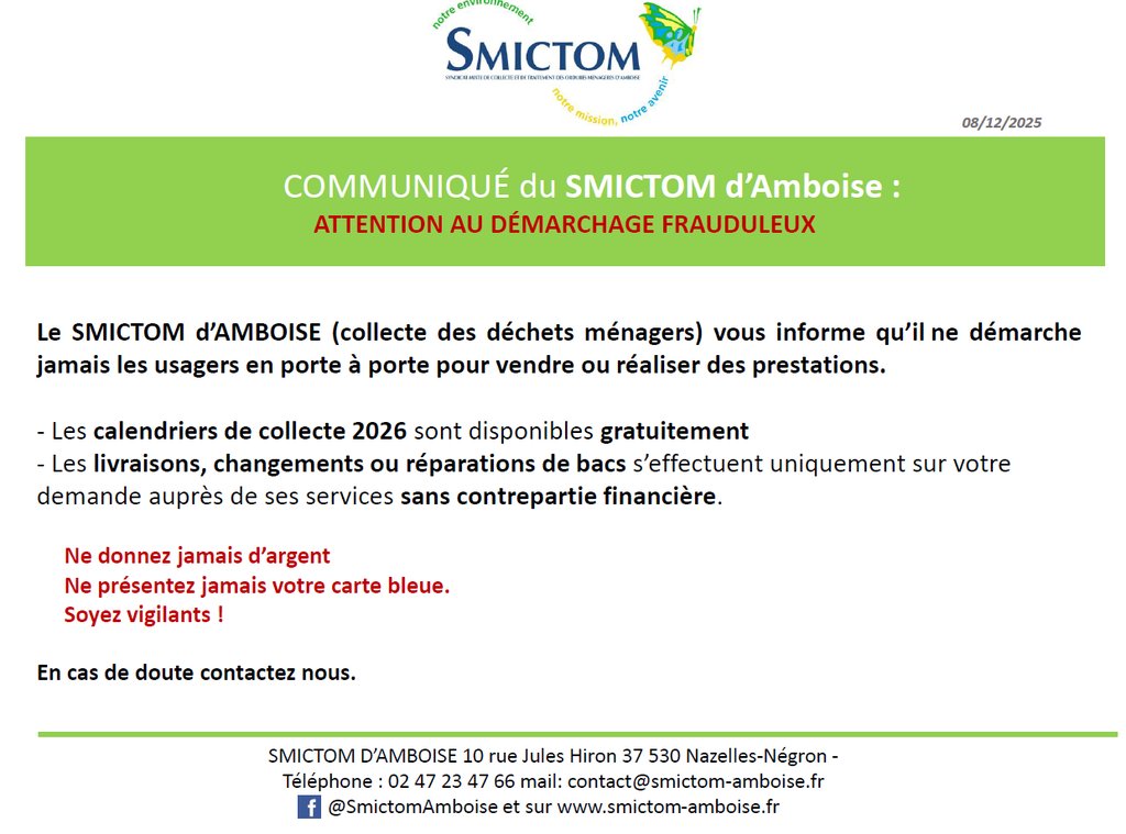 Suite à un nouveau signalement de démarchage frauduleux, nous souhaitons rappeler aux habitants de rester vigilants car le SMICTOM ainsi que ses prestataires ne demandent aucune contrepartie financière lors de la parution des calendriers de collecte ainsi que lors de leurs interventions.