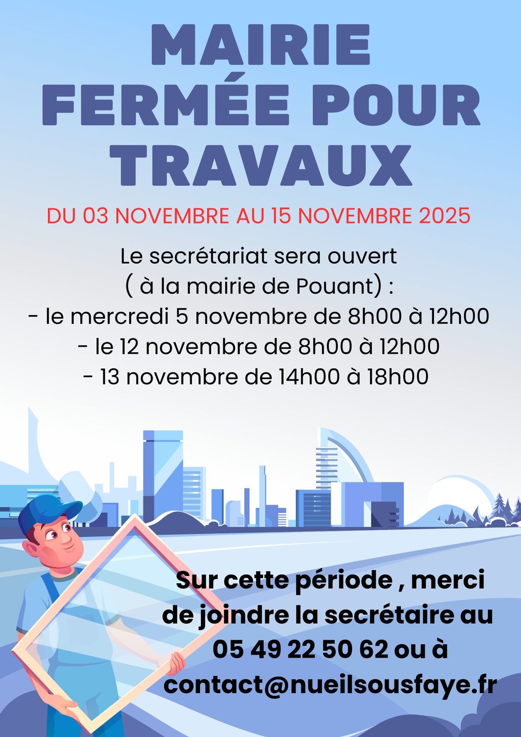 MAIRIE FERMEE POUR TRAVAUX - DU 3 NOVEMBRE AU 15 NOVEMBRE 2025