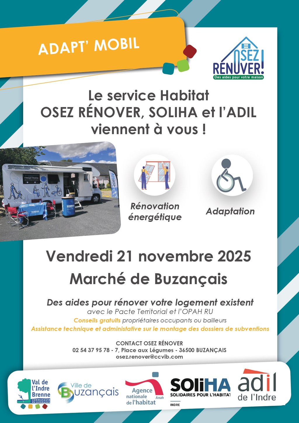 Le vendredi 21 novembre 2025, Osez rénover, SOLIHA et l'ADIL seront présents sur le marché de Buzançais pour répondre à vos questions sur la rénovation énergétique et l'adaptation des logements.