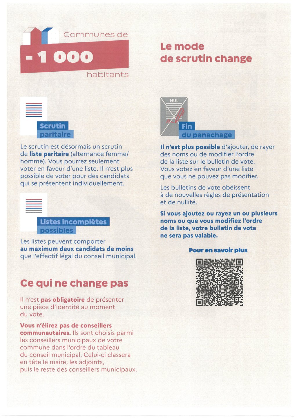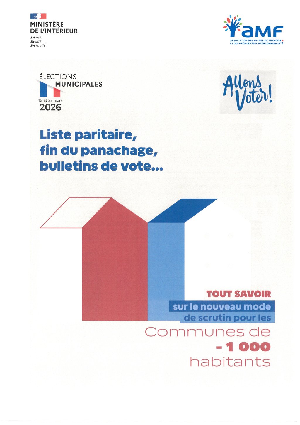 Je vous prie de bien vouloir trouver, en pièce jointe, un flyer, élaboré par l'AMF et le ministère de l'Intérieur, vous permettant de connaitre le nouveau mode de scrutin applicable dans les communes de moins de 1000 habitants.