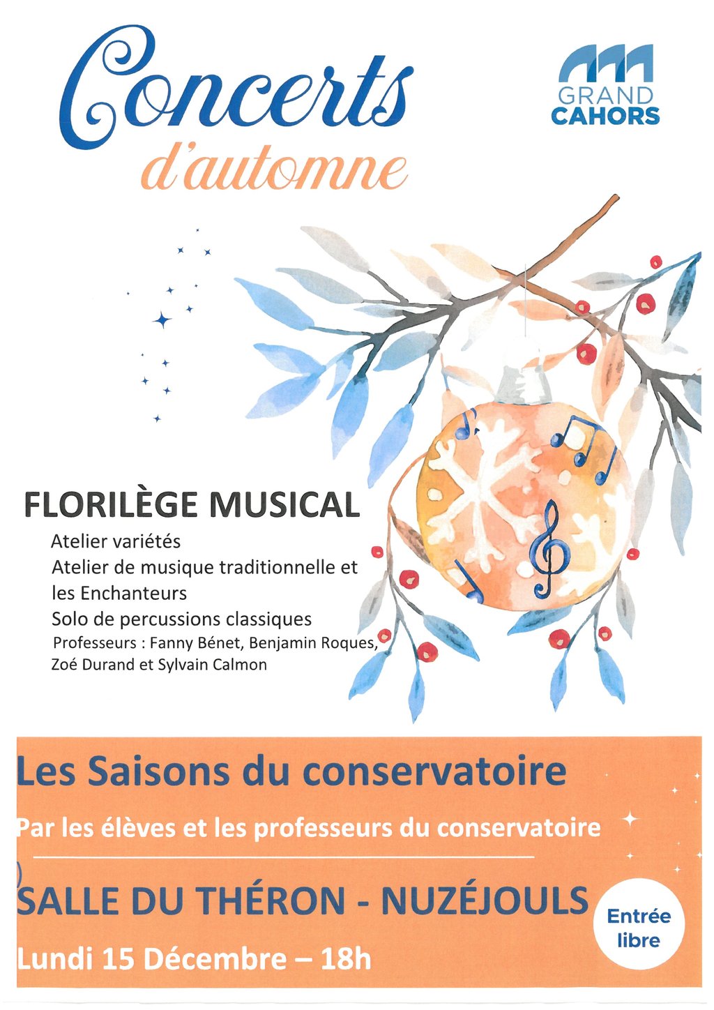 Lundi 15 Décembre à 18 h à la salle du Théron, le conservatoire du Grand Cahors vous propose un Florilège Musical par les élèves et les professeurs.