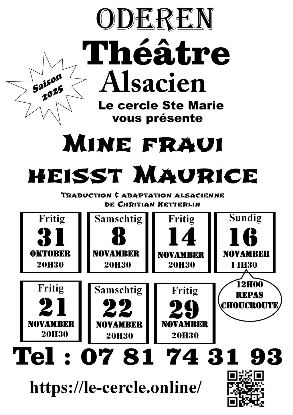 Le THÉÂTRE ALSACIEN de ODEREN présente sa nouvelle pièce “Mine Fraui heisst Maurice” traduite et adaptée par Christian KETTERLIN.Georges, un agent immobilier infidèle qui a des soucis conjugaux, décide de faire appel à un certain Maurice Lappin (bénévole dans une association caritative, et employé à mi-temps à La Poste) pour se faire passer pour sa femme dans l’espoir de se débarrasser de sa maîtresse, reconquérir son épouse et éviter la confrontation entre elles.Le dimanche 16 novembre à midi, il vous sera possible de partager un repas (choucroute). N'oubliez pas de réserver !