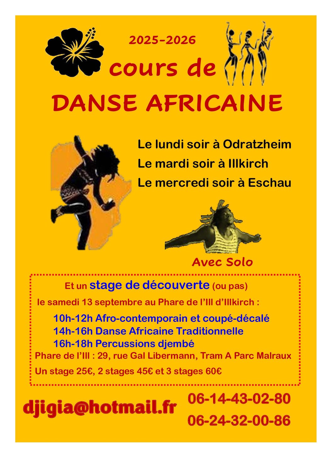 L'Association DJIGIA vous informe de la reprise des cours de Danse Africaine qui a lieu le Lundi soir de 20 heures à 21 heures au Centre Culturel, rue de l'Eglise à Odratzheim.