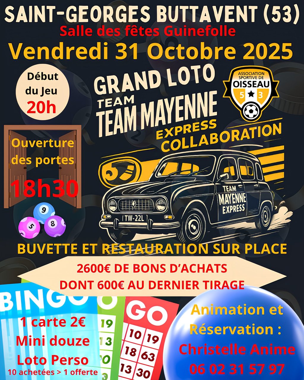 Team Mayenne Express organise son grand loto d’auto-financement pour participer au fameux 4L Trophy 2026. Cette nouvelle association organise cette manifestation à la salle des fêtes Guinefolle à Saint-Georges Buttavent en partenariat avec l’Association Sportive Oisselienne (ASO).
