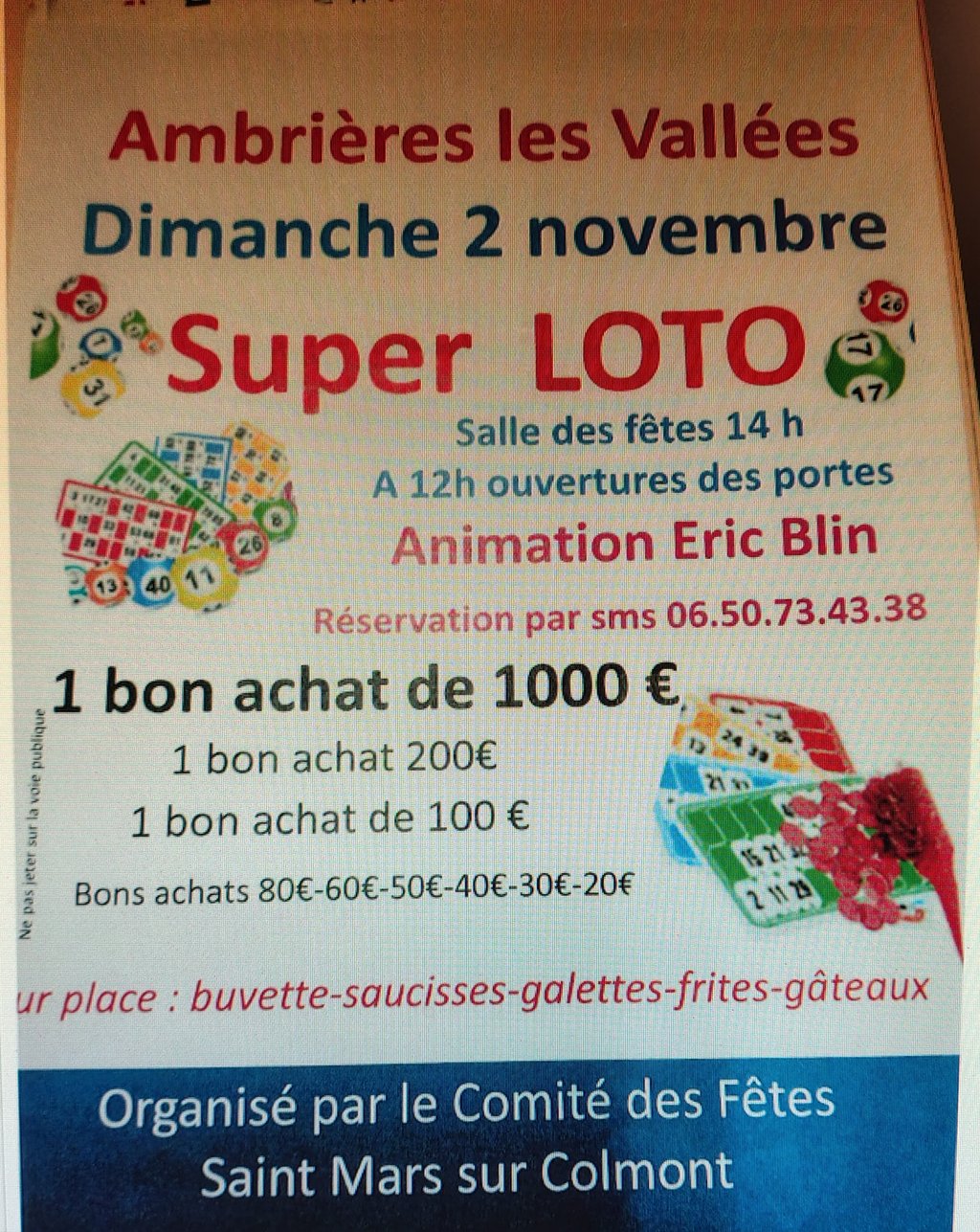 Le comité des Fêtes de Saint-Mars-sur-Colmont organise dimanche 2 novembre, un loto à la salle des fêtes d'Ambrières-les-Vallées.