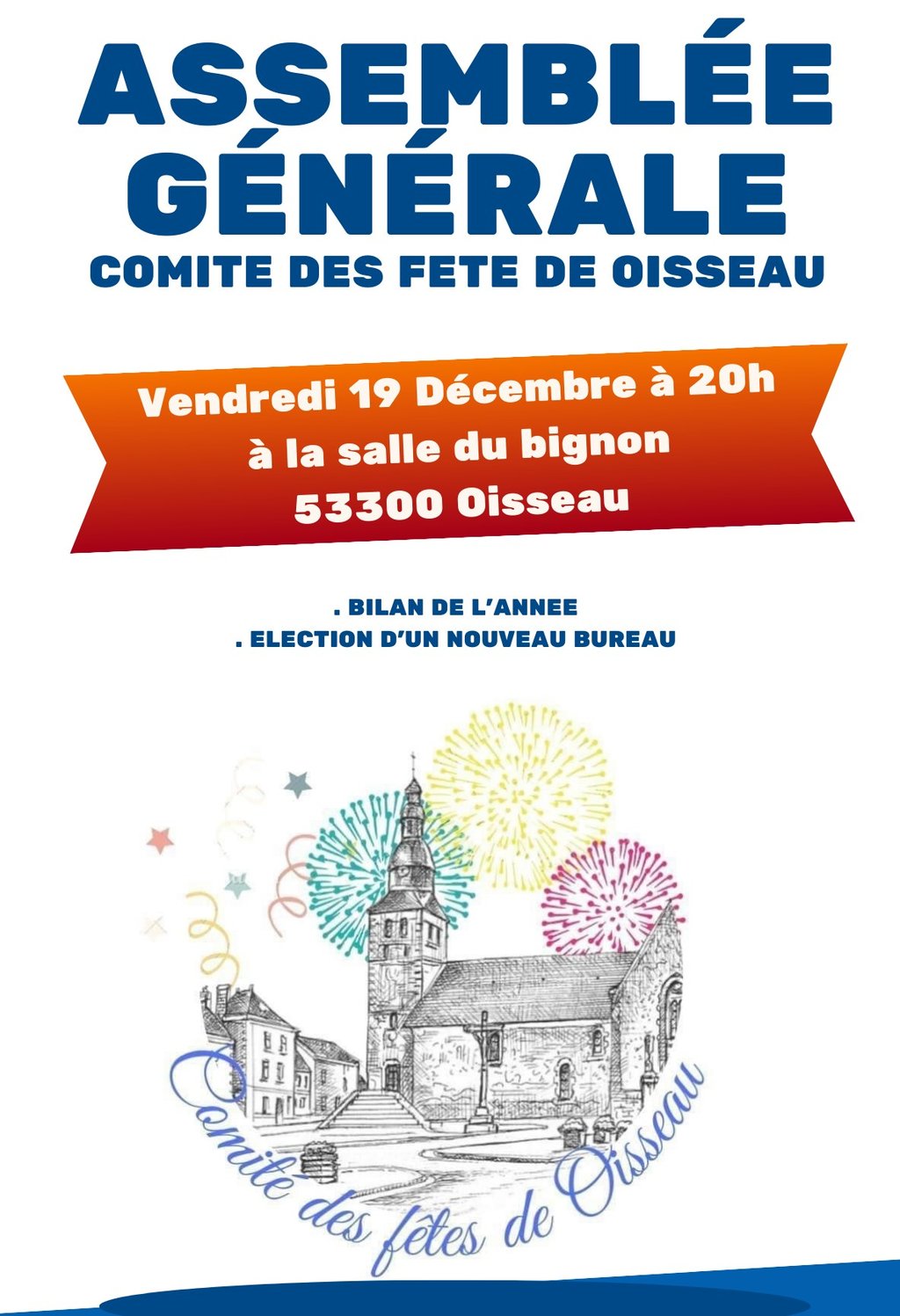 Le Comité des Fêtes de Oisseau a le plaisir de vous inviter à son Assemblée Générale qui se tiendra le vendredi 19 décembre à 20h, à la salle du Bignon