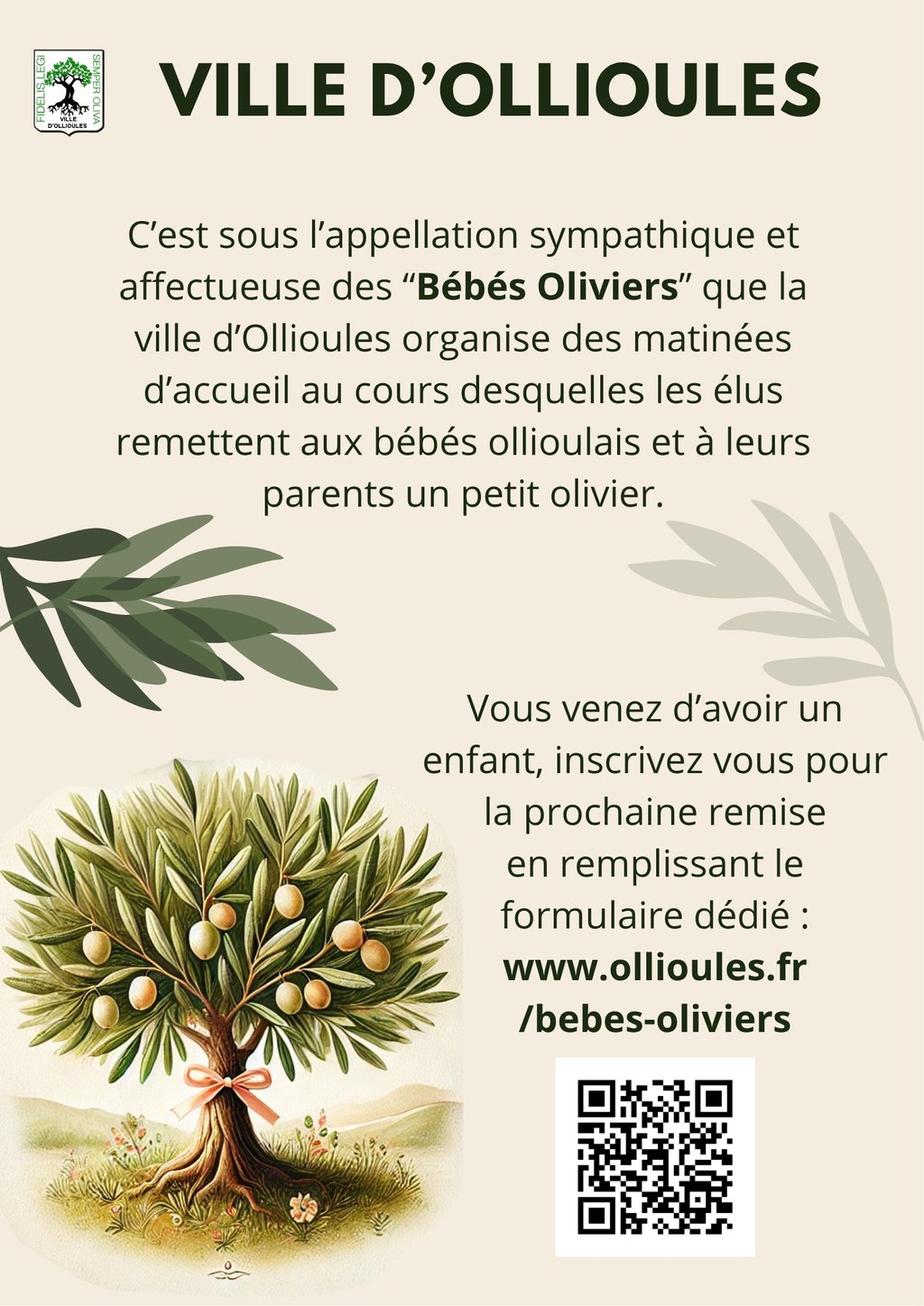 La ville d’Ollioules est ravie d’inviter les jeunes parents à participer à la prochaine cérémonie des Bébés Oliviers.