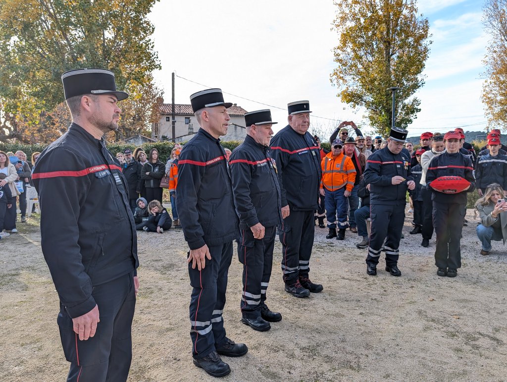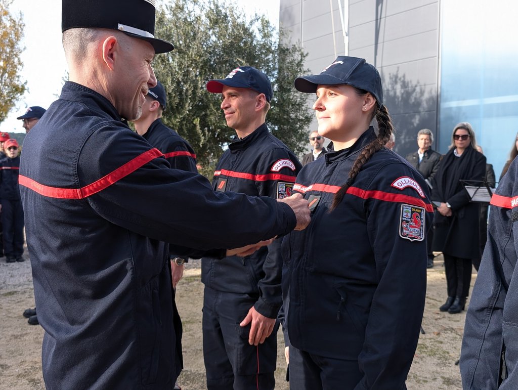 La première séquence officielle a été consacrée aux remises de décorations, ouvrant ainsi la mise à l’honneur de femmes et d’hommes ayant dédié de nombreuses années au service de la population. La médaille d’honneur des sapeurs-pompiers échelon argent a ainsi été remise au Sergent-chef Florent Guirado et au Caporal-chef Laurent Bourdon, tandis que l’échelon bronze a récompensé Enzo Pereira, sapeur de première classe. Ces distinctions ont été remises Robert Beneventi, maire d’Ollioules, Sandra Kuntz, conseillère régionale représentant le président Renaud Muselier, et Laetitia Quilici, vice-présidente du Conseil départemental, représentant le président Jean-Louis Masson, accompagnés du Lieutenant 1re classe Jérôme Silvestri. La cérémonie s’est poursuivie avec une série de promotions de grades, marquant les avancées professionnelles de plusieurs sapeurs-pompiers du centre. Ont notamment été promus : Alexandre Choiset, nouvel adjudant, Franck Breniaux et Sébastien Lantier, désormais sergents appellation chef, Louison Croche, promu sergent, Vincent Chardard, nouveau caporal, et Célestine Olart, élevée au grade de sapeur de 1ère classe. Le rituel s’est achevé avec la remise symbolique du casque au jeune Sapeur 2e classe Victor Nuss, signe de la fin de sa formation initiale. Moment particulièrement émouvant, la mise à l’honneur des nouveaux sapeurs-pompiers honoraires, admis à ce titre après de longues années de service. Ils s’agit de Marc Sampieri, devenu lieutenant honoraire après 35 années d’engagement, Ludovic Marguerie, promu adjudant honoraire après 31 ans de service, Laurent Bourdon, élevé au grade de sergent honoraire après 20 années de carrière . À chacun ont été remis leur nouveau grade ainsi que l’insigne officiel d’ancien sapeur-pompier, symbole de reconnaissance de la profession. Ces décorations ont été remise par Le Lieutenant-Colonel Michel PERSOGLIO, représentant le Contrôleur Général Eric GROHIN, Directeur Départemental des Sapeurs-Pompiers du Var, le Commandant Laurent ROQUES, Adjoint au chef du groupement fonctionnel Soutien Logistique, le Capitaine Sébastien CAMPS, représentant le Colonel hors classe Jacques BAUDOT chef du groupement territorial ouest, et Le lieutenant Jean-Luc DECITRE, Président de l’Union Départementale des Sapeurs-Pompiers du Var, accompagnés par le Lieutenant 1ère classe Jérôme SILVESTRI » Puis il y a eu les prises de paroles, de l’Adjudant Alexandre Choiset, président de l’amicale, du Lieutenant 1re classe Jérôme Silvestri, chef du centre, et des élus de la commune, du Département et de la Région. Tous ont salué l’engagement, la solidarité et le sens du devoir des sapeurs-pompiers d’Ollioules.