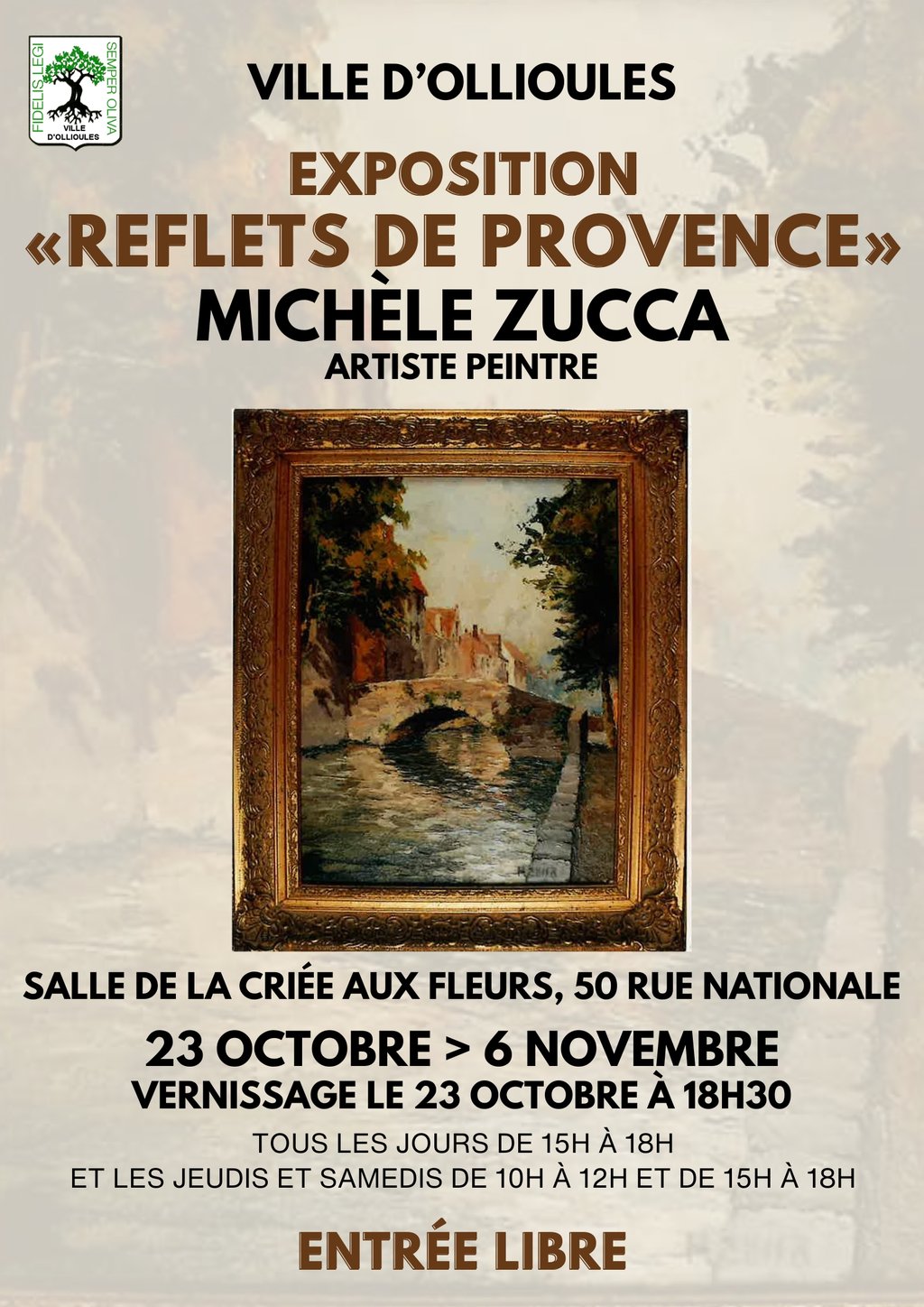 La Ville d’Ollioules accueille du 23 octobre au 6 novembre l’exposition “Reflets de Provence” de l’artiste Michèle Zucca, à la salle de la Criée aux Fleurs, 50 rue Nationale.