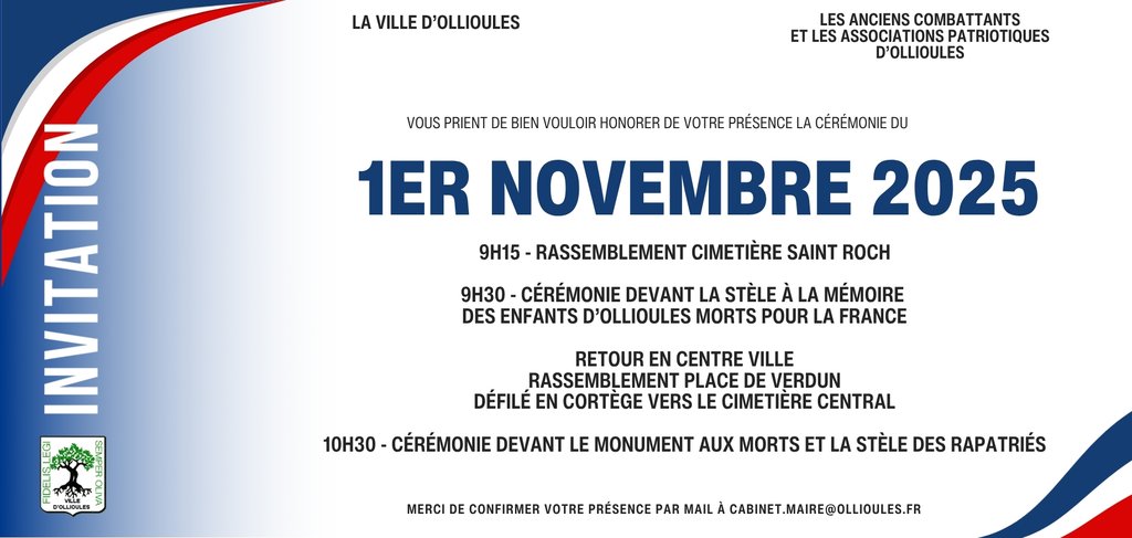 La Ville d’Ollioules invite la population à assister à la cérémonie du 1er novembre 2025, en hommage aux enfants d’Ollioules morts pour la France. Le rassemblement est prévu à 9h15 au cimetière Saint-Roch, où la cérémonie débutera à 9h30.