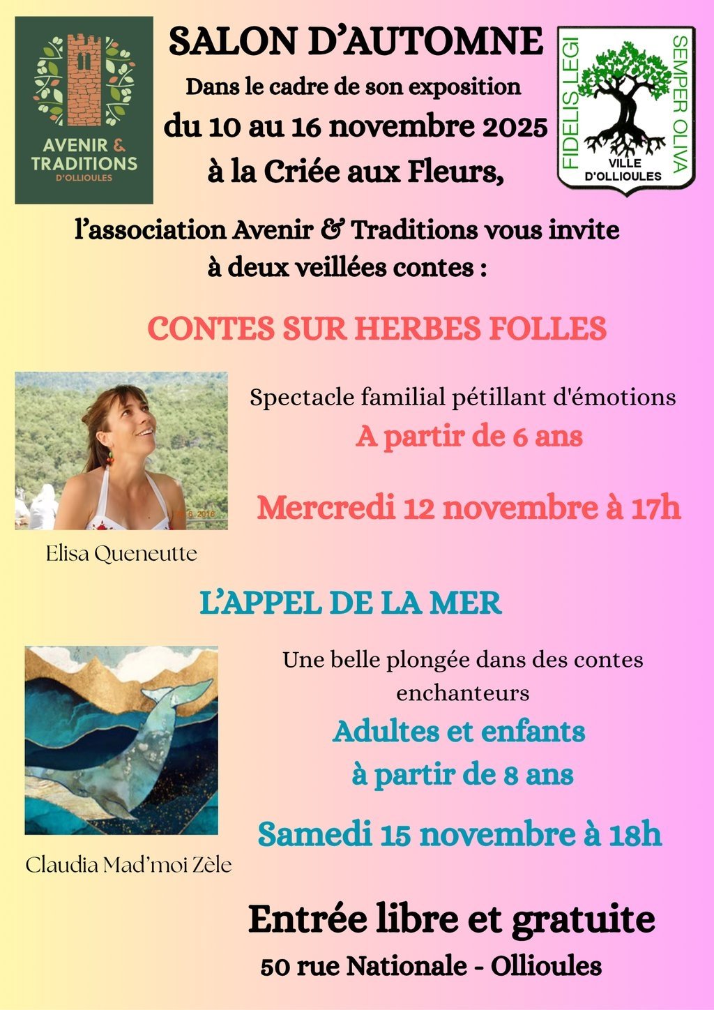 Dans le cadre du Salon d’Automne organisé par l’association Avenir et Traditions d’Ollioules, le samedi 15 novembre à 18h, le public est invité à embarquer pour « L’appel de la mer », une belle plongée dans des contes enchanteurs interprétés par Claudia Mad’moi Zèle. À partir de 8 ans.