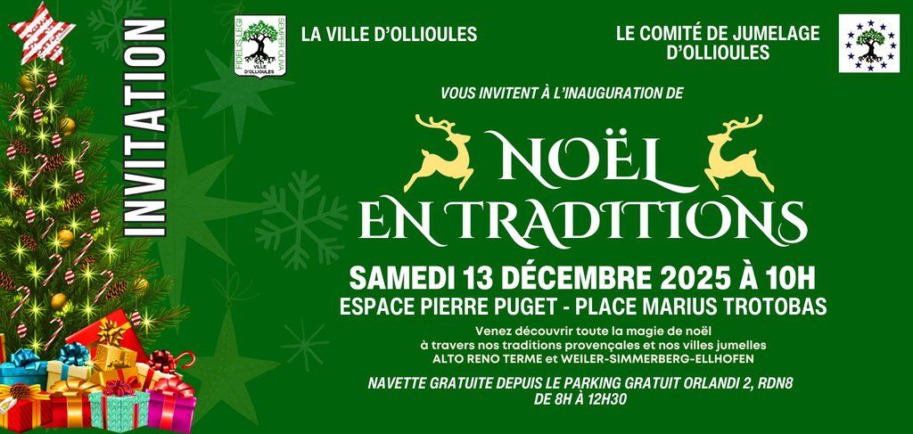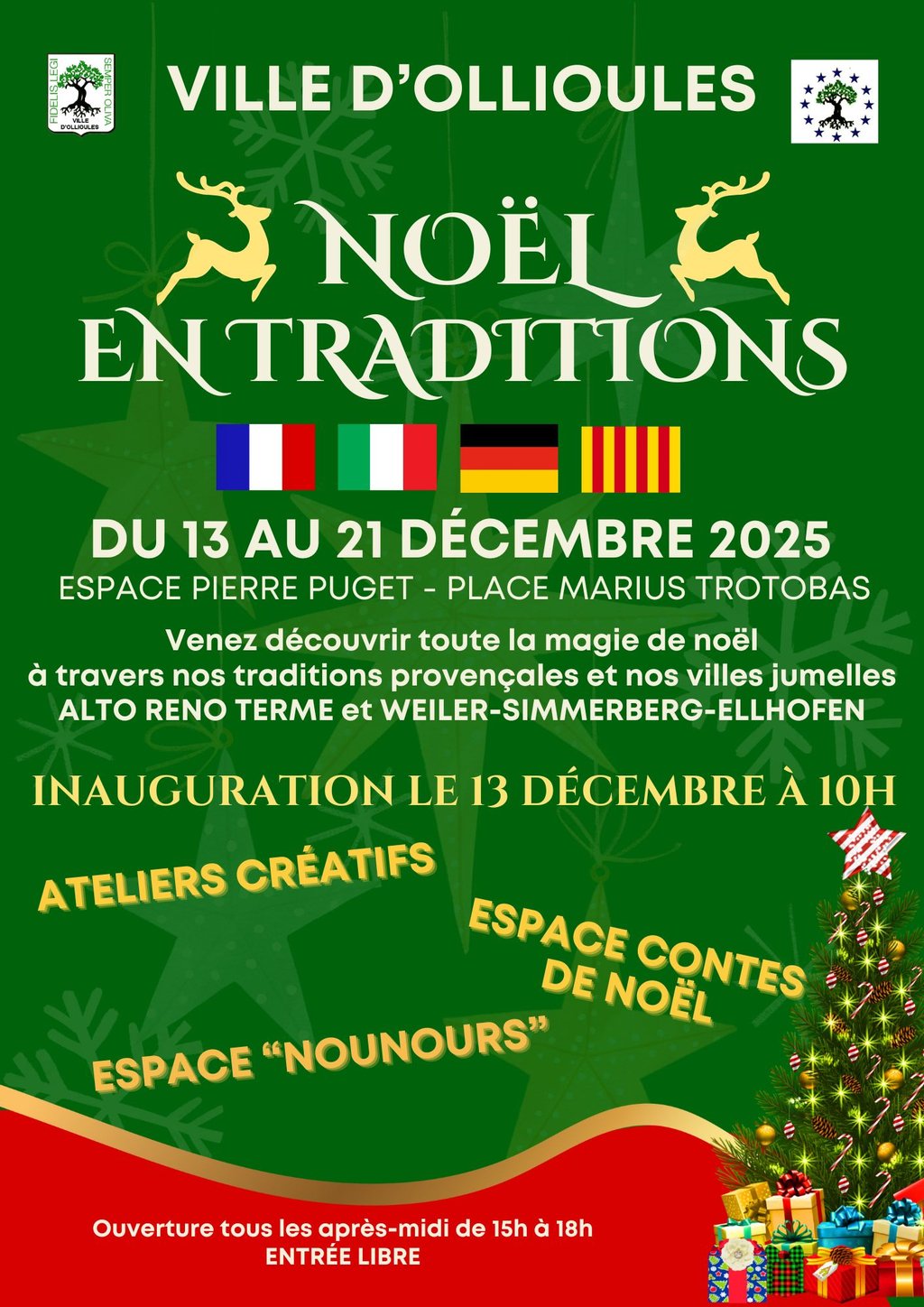 Le Comité de Jumelage d’Ollioules, présidé par Janine Fontana, vous propose son animation « Noël en Traditions », les 13, 14, 17, 20 et 21 décembre 2025 à l’Espace Pierre Puget
