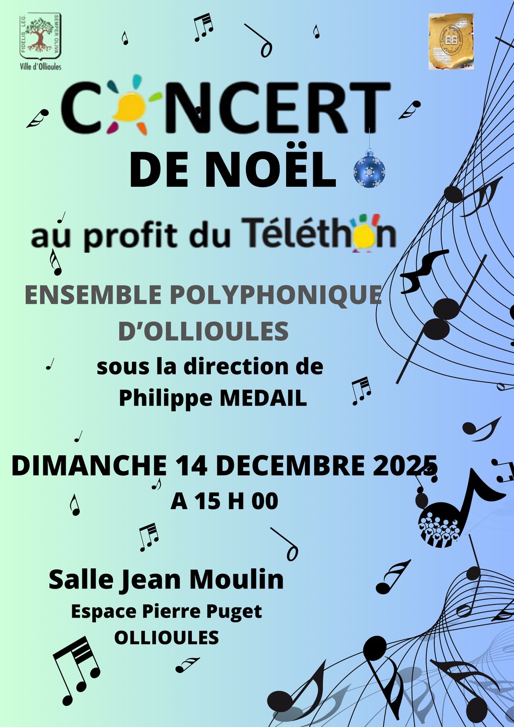 Dans le cadre des actions solidaires menées pour le Téléthon, la Ville d’Ollioules accueille un Concert de Noël interprété par l’Ensemble Polyphonique d’Ollioules, placé sous la direction de Philippe Médail, le dimanche 14 décembre 2025 à 15h00 à la Salle Jean Moulin – Espace Pierre Puget