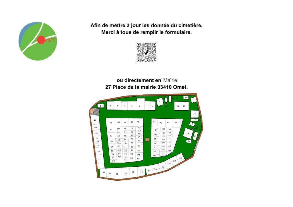 À l'occasion de la TOUSSAINT, et dans le but de mettre à jour nos données sur notre cimetière, il vous est demandé de nous communiquer, soit par internet, pour ceux qui sont habitués, directement en complétant le formulaire en ligne, en utilisant le qrcode ci-dessus, ou celui sur l'affiche posée sur le portail du cimetière, ou bien le lien ci-dessous, soit en vous présentant dès que possible au secrétariat de la mairie (aux horaires d'ouverture).