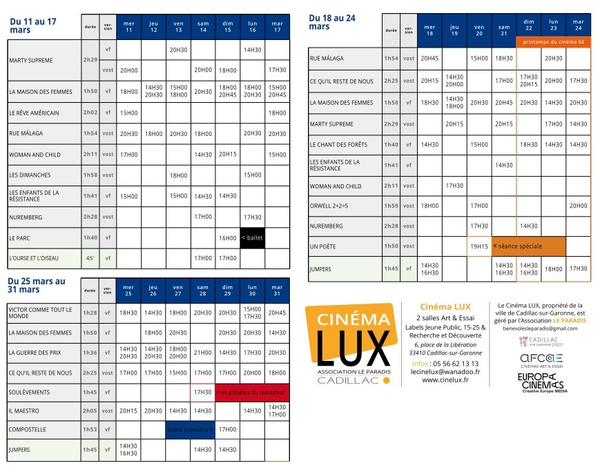 Le Cinéma LUX de Cadillac-sur-Garaonne vous informe des prochaines projections pour le mois de mars 2026.