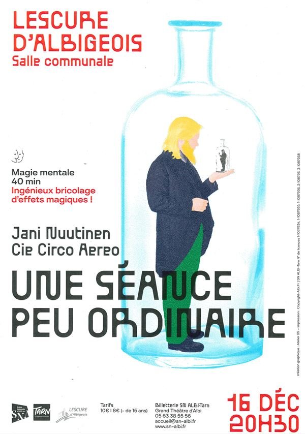 Ce bonhomme au léger accent finnois, au regard bleu acier, aux allures d’un docteur en sciences occultes, vous embarque dans un monde où vos certitudes deviennent des doutes, où votre vision vous joue des tours. Jani Nuutinen, artisan majeur du cirque contemporain (manipulateur d’objets, mentaliste et bricoleur insolite) se livre à des expérimentations chimiques épatantes et plutôt risquées… Il y mêle humour, émotion, trouvailles et inattendu. D’un tour de main, le magicien fait surgir l’incompréhensible.