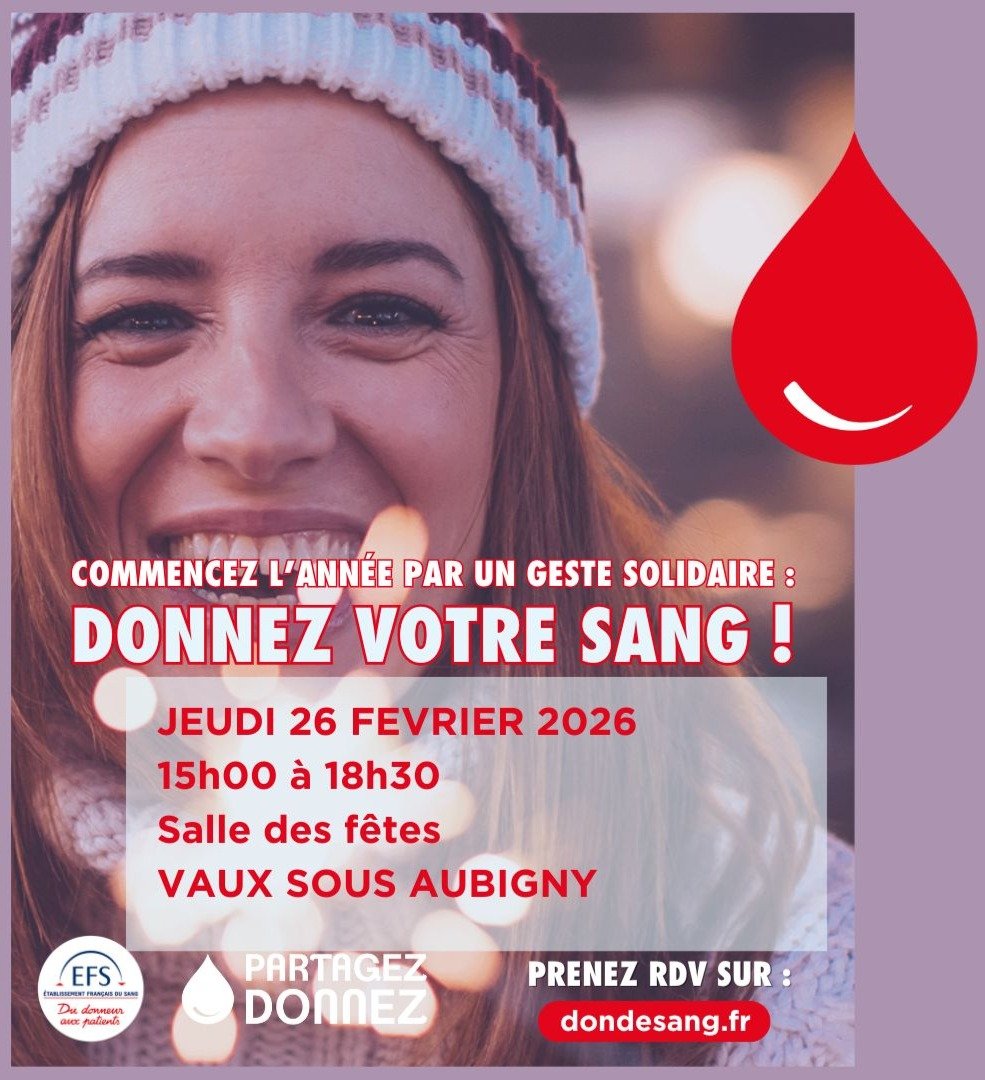 𩞠[DON DE SANG] - Venez donner votre sang le 26 fĂ©vrier 2026 Ă la Salle des fĂȘtes de Vaux-Sous-Aubigny !