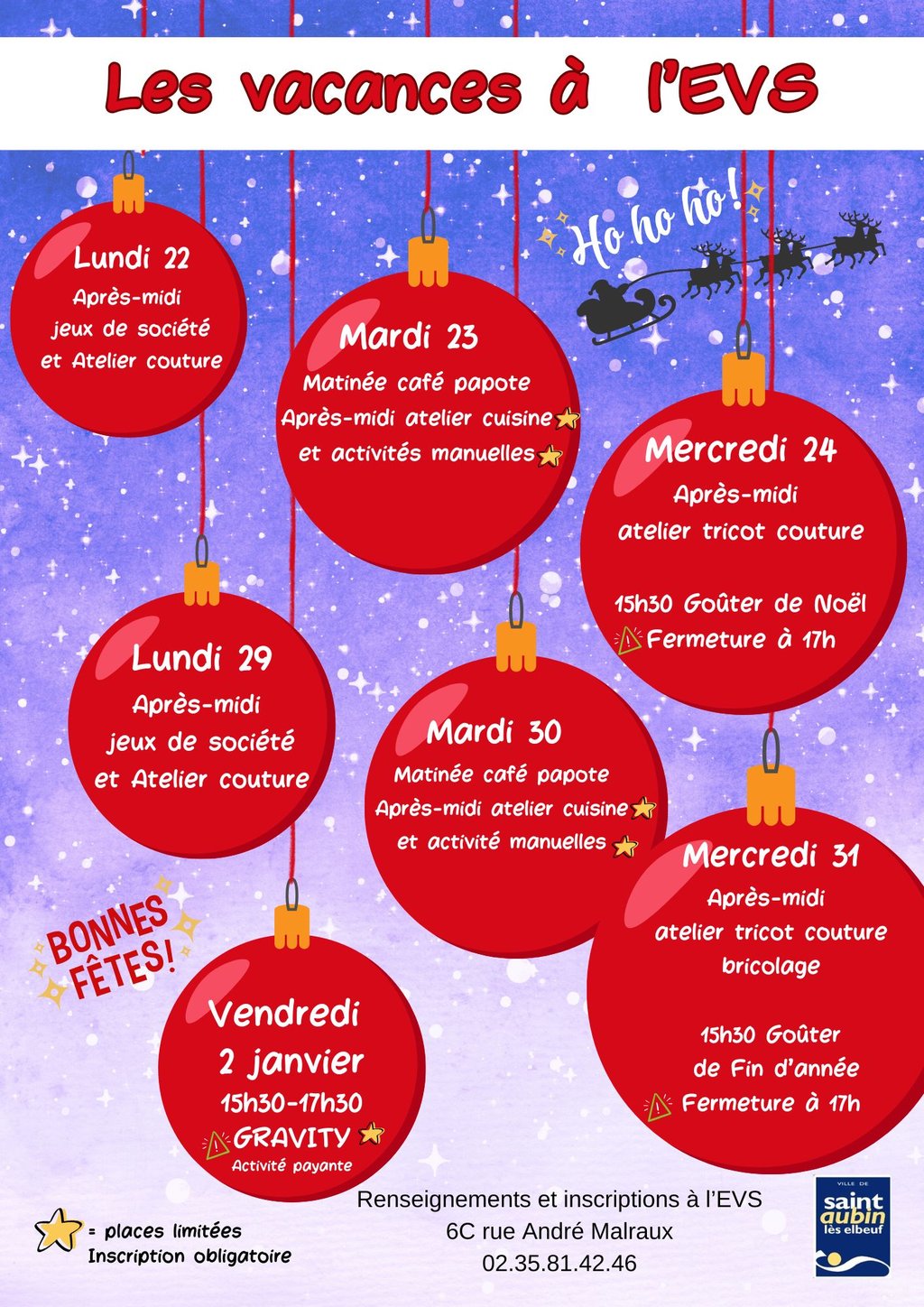 L’Espace de Vie Sociale vous accueille tout au long des vacances avec un programme varié : ateliers créatifs, sortie Gravity, goûter de Noël et de fin d'année...