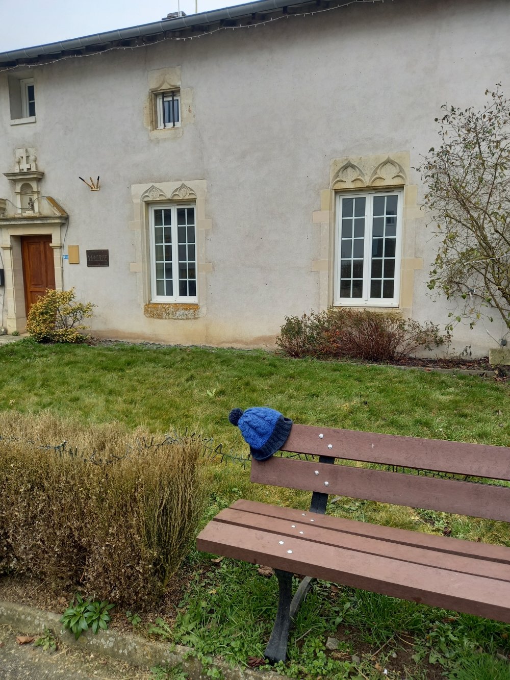 Depuis avant les fêtes de fin d'année, un bonnet a été oublié sur le banc devant la mairie ou déposé là ...
