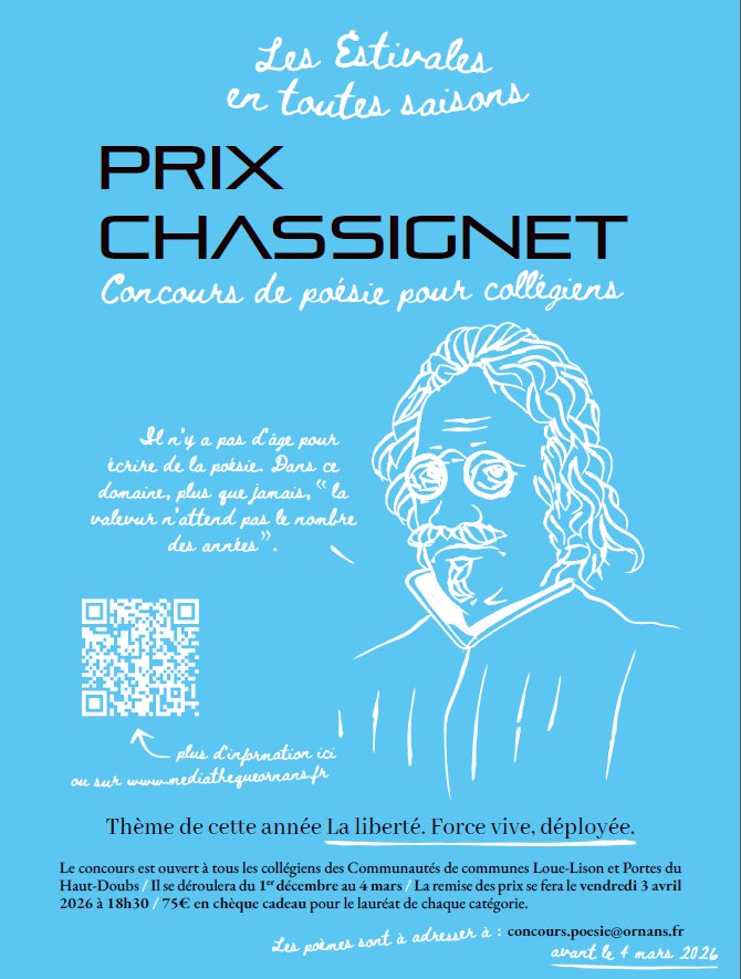 Découvrez le règlement complet du concours ici : https://www.mediathequeornans.fr/infos-pratiques/on-en-parle/prix-chassignet-2025