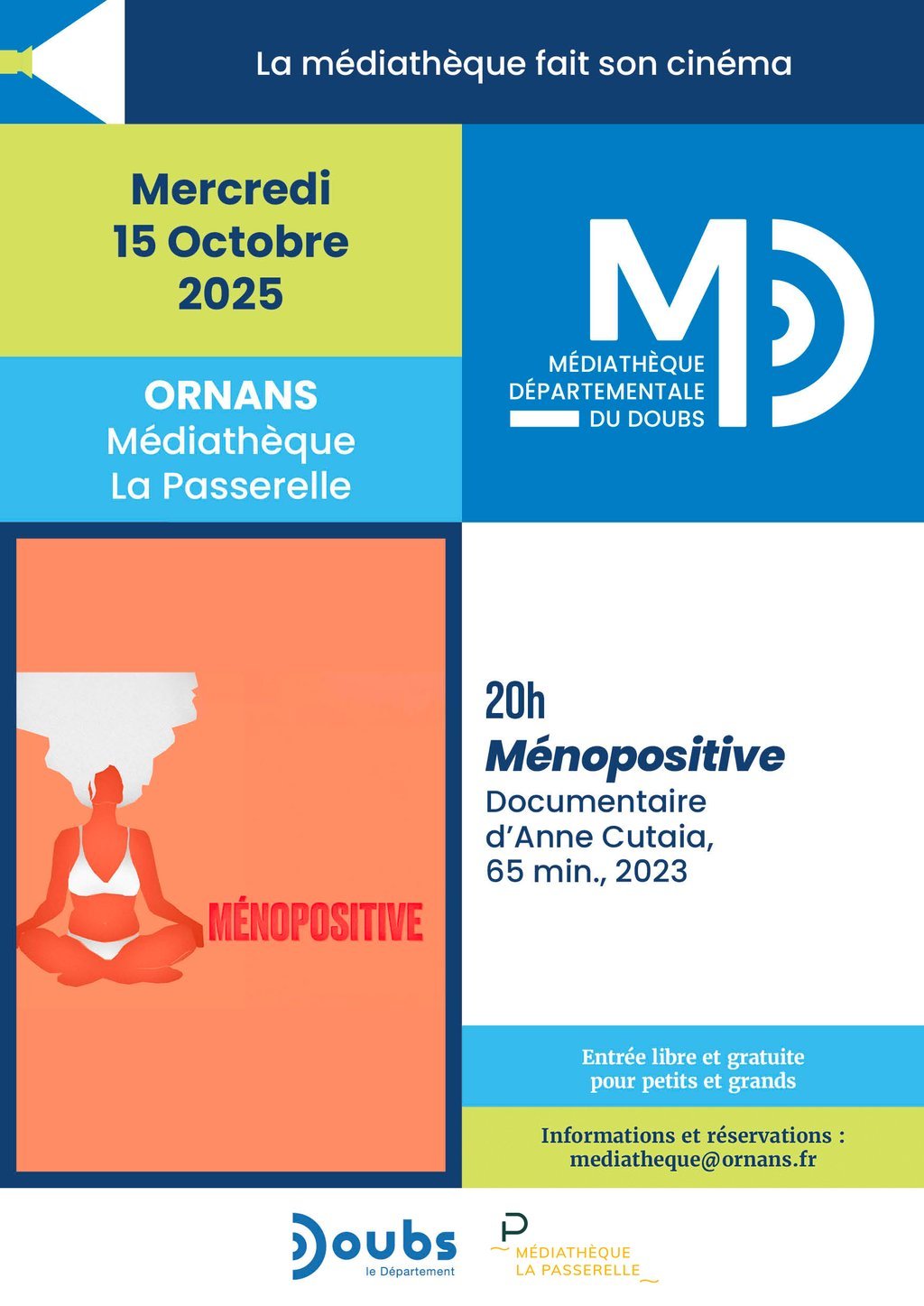 La médiathèque La Passerelle vous propose, en partenariat avec la médiathèque départementale du Doubs et la Communauté de communes Loue Lison, une projection de Ménopositive, un documentaire sensible et engagé qui met en lumière avec humour et authenticité les vécus de femmes autour de la ménopause, un sujet encore trop souvent tabou.