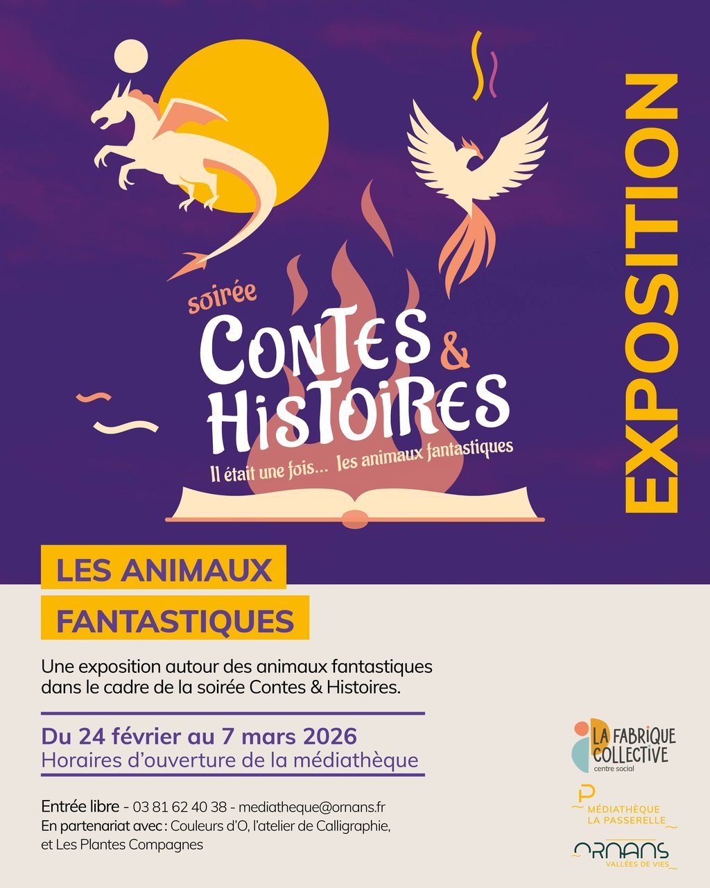 Dans le cadre de la soirée Contes & Histoires prévue le samedi 7 mars prochain, la médiathèque La Passerelle vous propose une exposition d’œuvres sur le thème des animaux fantastiques.