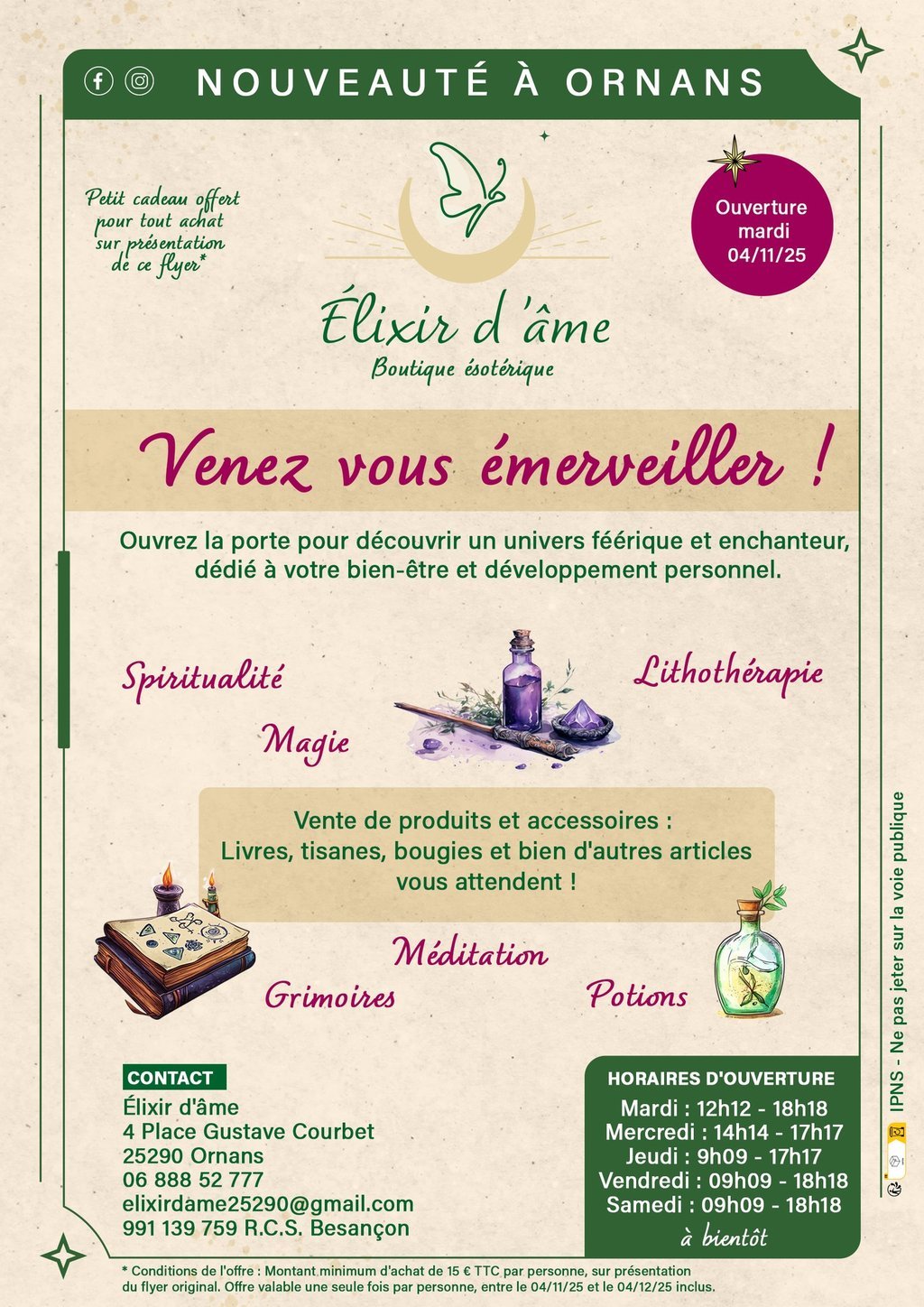 Elixir d'âme est une boutique ésotérique axée sur le bien-être et le développement personnel. "Passez la porte et découvrez un espace calme et reposant pour vous ressourcer, rêver et vous émerveiller, loin du tumulte de la vie quotidienne."