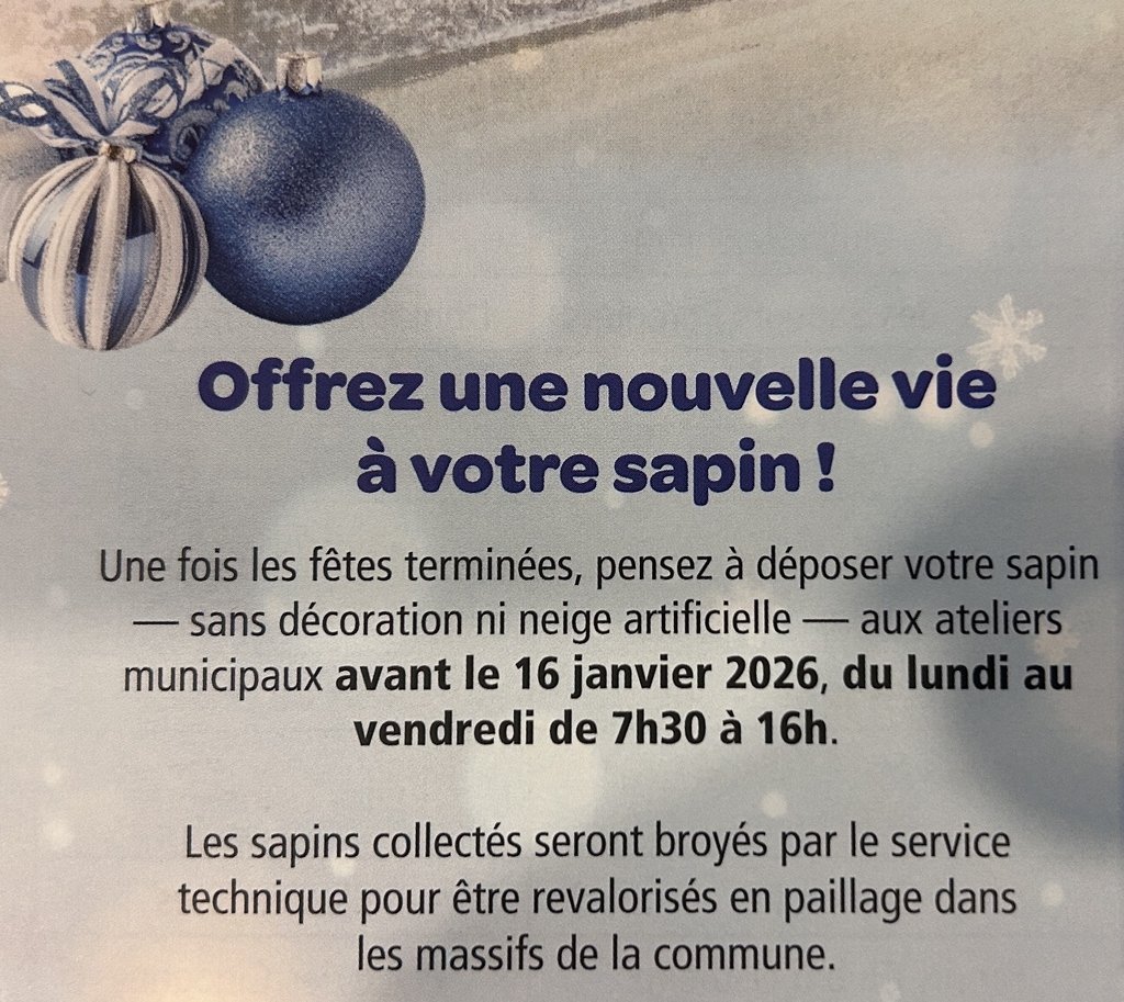Votre sapin mérite une fin à la hauteur du plaisir qu'il vous a apporté !Alors avant ce vendredi pensez à le rapporter aux ateliers municipaux ouverts de 7h30 à 16h. Votre sapin servira à tous via le paillage des massifs de la commune. N'oubliez pas 🤗